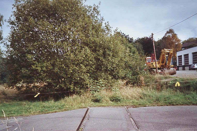 Bahndamm dahinter sind noch vorhanden und dienen heute einem Wirtschaftsweg